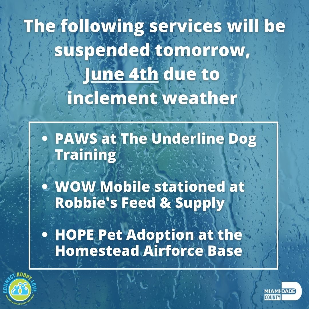 Miami Dade County Animal Services On Twitter Please Be Advised Due To Inclement Weather And Expected Flooding Conditions The Following Events And Services Will Be Suspended For June 4th Paws At The Underline
